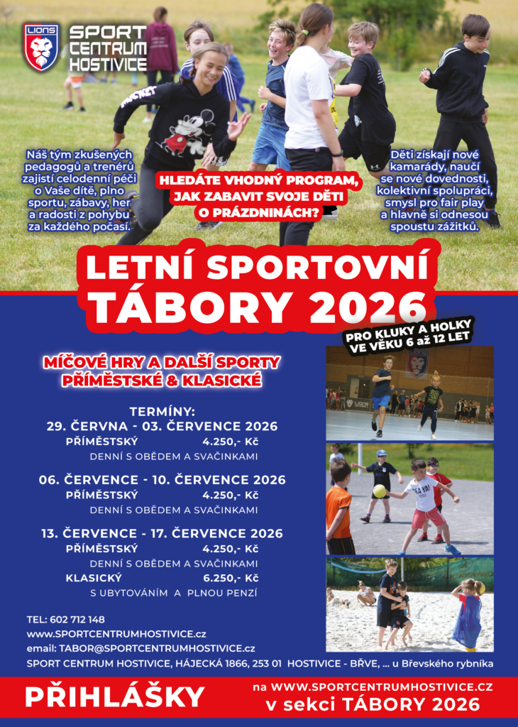 Aktuálně je možno se přihlašovat na letní SPORT klasické a příměstské TÁBORY 2025 https://sportcentrumhostivice.cz/tabory/