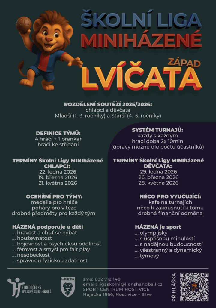 ŠKOLNÍ LIGA MINIHÁZENÉ LVÍČATA ZÁPAD 25/26Chcete-li vyplnit tento formulář, prosím povolte v prohlížeči JavaScript.Chcete-li vyplnit tento formulář, prosím povolte v prohlížeči JavaScript.název základní školy *jméno a příjmení kontaktní osoby pro komunikaci *Křestní jménoPříjmeníemail kontaktní osoby pro komunikaci *E-mailPotvrďte e-mailtelefon kontaktní osoby pro komunikaci *věkové kategorie školních týmu či týmůCHLAPCI MLADŠÍ ... 1.-3. ročníkyDĚVČATA MLADŠÍ ... 1.-3. ročníkyCHLAPCI STARŠÍ ... 4.-5. ročníkyDĚVČATA STARŠÍ ... 4.-5. ročníky... možno označit jednu nebo více kategorií plánovaných týmů za Vaší školu (předběžně)účast na jednotlivých kolechCHLAPCI 1. kolo ... 22.01.2026DĚVČATA 1. kolo ... 29.01.2026CHLAPCI 2. kolo ... 19.03.2026DĚVČATA 2. kolo ... 26.03.2026CHLAPCI 3. kolo ... 21.05.2026DĚVČATA 3. kolo ... 28.05.2026... ideální je účast na všech termínech chlapců či děvčatpředběžný zájem o ukázkové hodinyANONE komunikaci školních věkové případný rychlý dotaz k zodpovězení od násODESLAT
